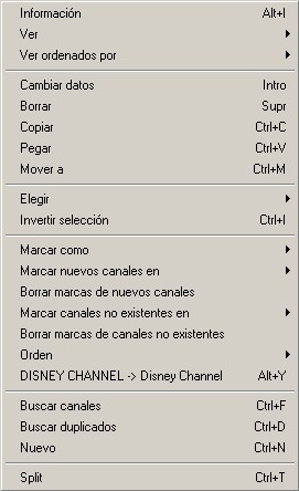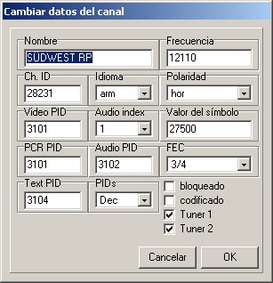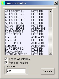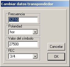 La ventana principal con la lista de satétites, Transpondedores, favoritos, y los canales.