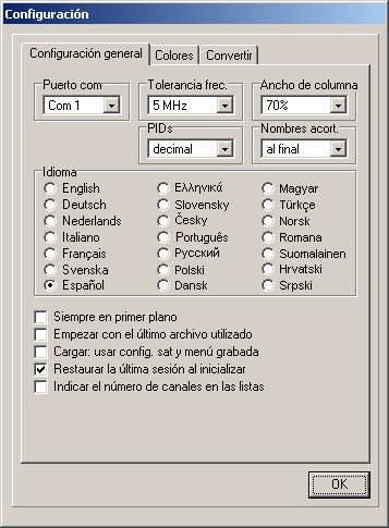 Aquí puede elegir el idioma del menú, configurar los puertos de comunicacóin, elegir si quiere ver/introducer PIDs en decimal o hexadecimal, introducer la tolerancia de frecuencia para la importación, mantener el editor siempre en pantalla o cambiar los colores en la lista de objetos.