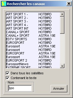 La fentre principale, vous voyez tous les satellites, transpondeurs, FAV, et naturellement les canaux.