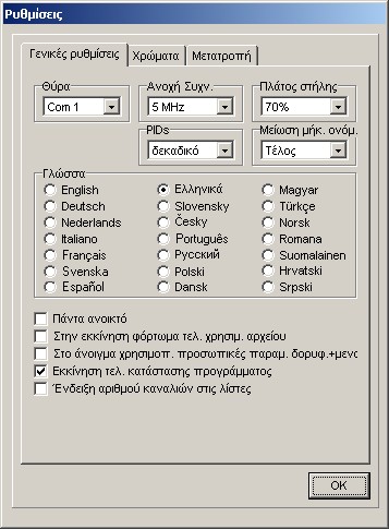 Εδώ μπορείτε να επιλέξετε γλώσσα, τη μορφή των PID (δεκαδική ή δεκαεξαδική) και της λίστας καναλιών, την ανοχή συχνότητας για την εισαγωγή άλλων μορφών(formats), και να ρυθμίσετε τα ports επικοινωνίας. Εξάλλου μπορείτε να αλλάξετε τη γραφή και τα χρώματα φόντου του SetEdit.