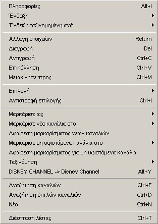 Το κύριο μενού της λίστας των καναλιών