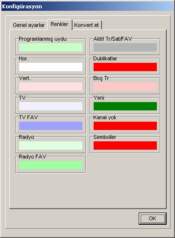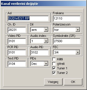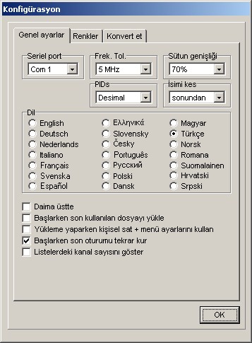 Burada menü dili, bağlantı yeri, PID'lerin ve kanal listesinin görüntüsü ayarlanır ve yabancı formatların importu için frekans toleransı verilir. Ayrıca burada SetEdit'in yazı ve ekran renklerini değiştirebilirsiniz.