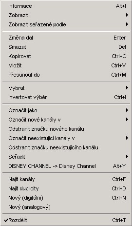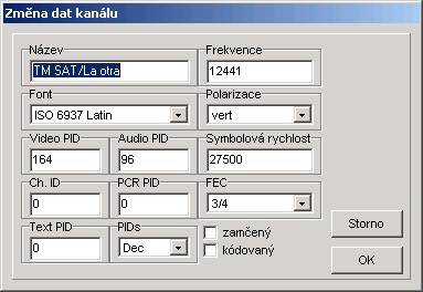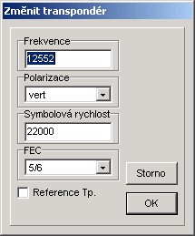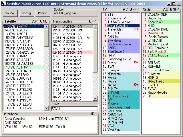 Hlavní okno, zde vidíte všechny satelity, transpondéry, FAV, žánr, a samozřejmě kanály