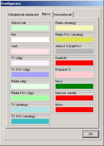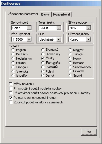 Zde mŭžete změnit jazyk menu, nakonfigurovat komunikační bránu, chcete-li vidět/zadat PIDs v desítkové či šestnáctkové soustavě, zadat frekvenci, toleranci pro import, umístit okno editoru vždy v horní části nebo změnit barvy jednotlivých položek seznamu.