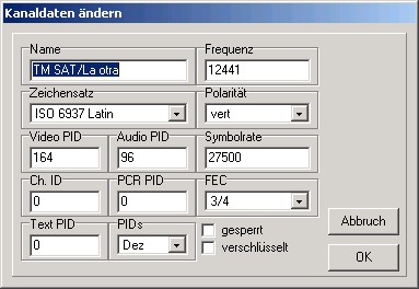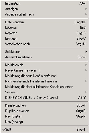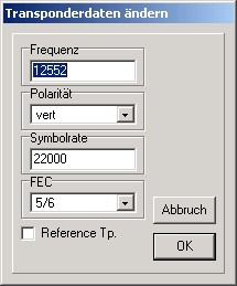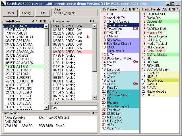 Das Hauptfenster, hier sehen Sie alle Satelliten, Transponder, Favoriten, Genres, und natürlich die Kanäle.