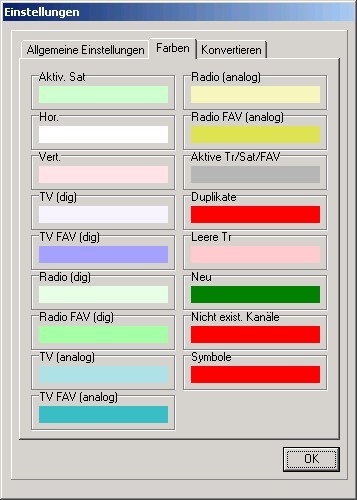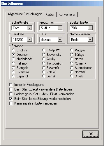 Hier werden die Menüsprache, die Schnittstelle, die Darstellung der PIDs und der Kanalliste eingestellt und eine Frequenztoleranz für den Import von Fremdformaten eingegeben. Außerdem können Sie hier die Schrift- und Hintergrundfarben von SetEdit verändern.
