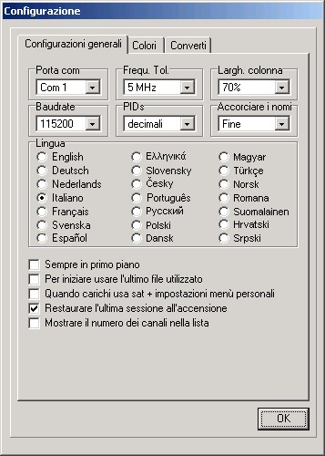 Da qui puoi scegliere il linguaggio del menu, configurare le porte di comunicazione, scegliere se preferisci vedere/inserire i PID in decimali o hexadecimali, inserire la tolleranza in frequenza per l'importazione, mantenere sempre l'editore in primo piano o cambiare i colori degli elementi della lista.