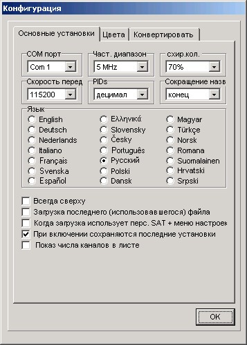 Здесь Вы можете выбрать язык меню, интерфейс, изображение PID, настройки листа каналов, задать допустимое отклонение частоты для импорта неизвестных форматов. Кроме того, вы можете здесь изменить шрифт и фон.