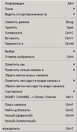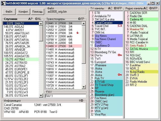 Главное окно, здесь Вы видите все спутники, транспондера, FAV, Жанр, и, конечно каналы