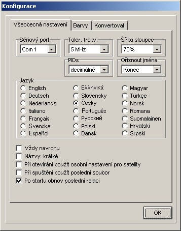 Zde mŭžete změnit jazyk menu, nakonfigurovat komunikační bránu, chcete-li vidět/zadat PIDs v desítkové či šestnáctkové soustavě, zadat frekvenci, toleranci pro import, umístit okno editoru vždy v horní části nebo změnit barvy jednotlivých položek seznamu.