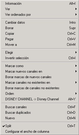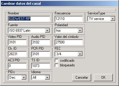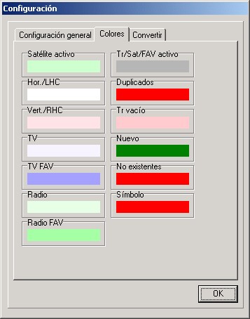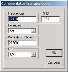 La ventana principal con la lista de satétites, Transpondedores, favoritos, y los canales.