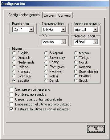 Aquí puede elegir el idioma del menú, configurar los puertos de comunicacóin, elegir si quiere ver/introducer PIDs en decimal o hexadecimal, introducer la tolerancia de frecuencia para la importación, mantener el editor siempre en pantalla o cambiar los colores en la lista de objetos.