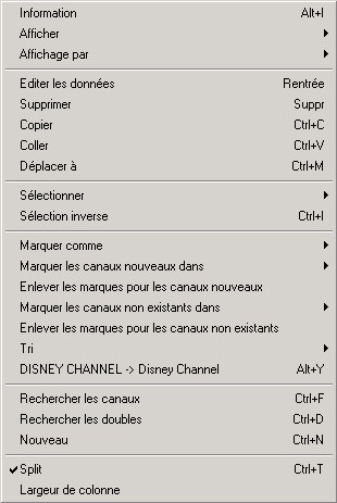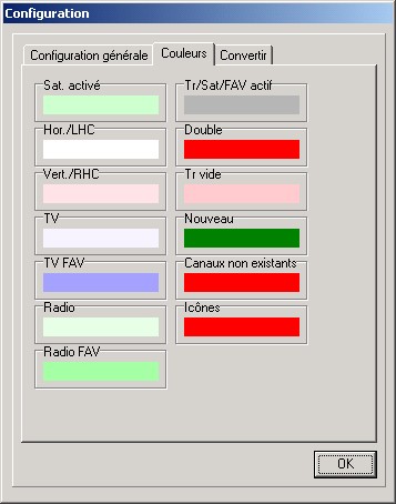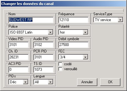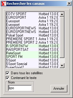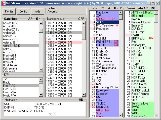 La fentre principale, vous voyez tous les satellites, transpondeurs, FAV, et naturellement les canaux.