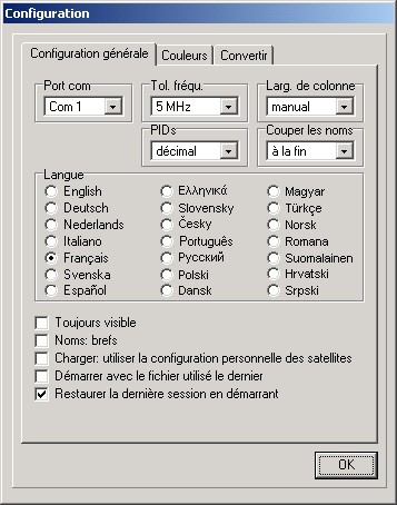 Ici vous pouvez choisir la langue du menu, choisir si vous voulez voir/entrer les PIDs en dcimal ou en hexadcimal, entrer la tolrance de la frquence pour l'import, changer les couleurs et entrer les donnes du rseau.