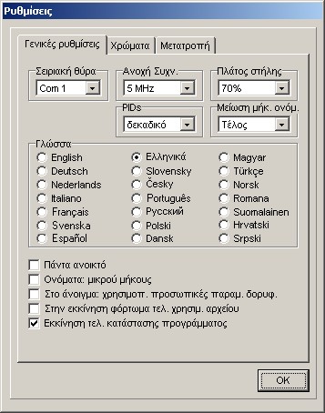 Εδώ μπορείτε να επιλέξετε γλώσσα, τη μορφή των PID (δεκαδική ή δεκαεξαδική) και της λίστας καναλιών, την ανοχή συχνότητας για την εισαγωγή άλλων μορφών(formats), και να ρυθμίσετε τα ports επικοινωνίας. Εξάλλου μπορείτε να αλλάξετε τη γραφή και τα χρώματα φόντου του SetEdit.