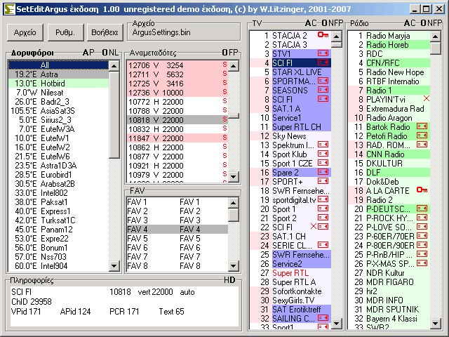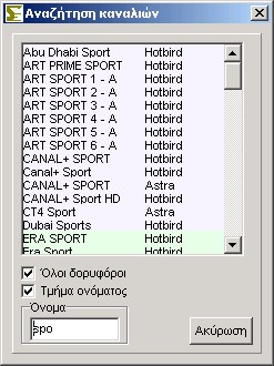 Το κυρίως παράθυρο, εδώ βρίσκονται: δορυφόροι, αναμεταδότες, αγαπημένα, και φυσικά τα κανάλια.