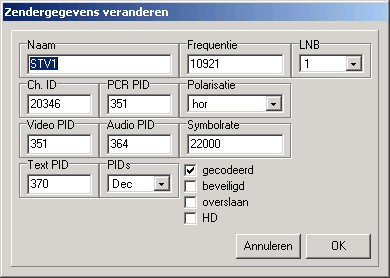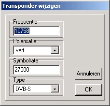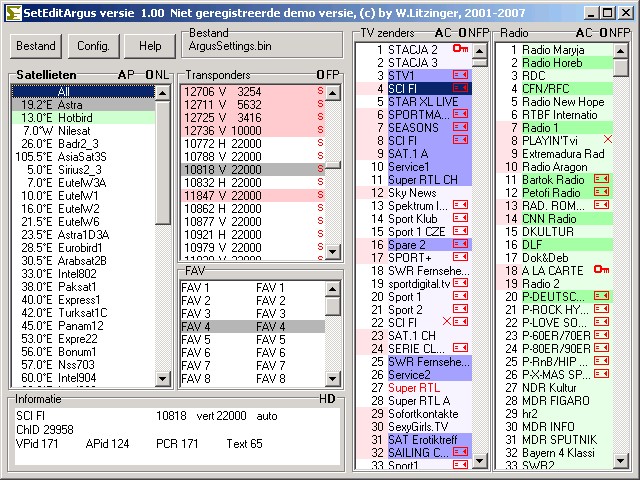 Het hoofdvenster, hier ziet u alle satellieten, transponders, Fav lijst, en natuurlijk de zenders