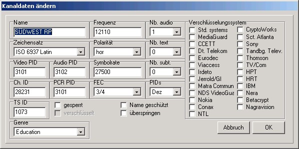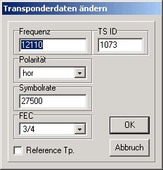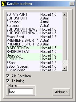 Das Hauptfenster, hier sehen Sie alle Satelliten, Transponder, Provider, Favoriten, und natürlich die Kanäle.