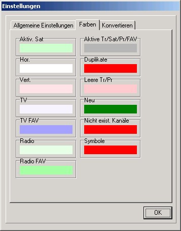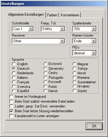 Hier werden die Menüsprache, die Schnittstelle, die Darstellung der PIDs und der Kanalliste eingestellt und eine Frequenztoleranz für den Import von Fremdformaten eingegeben. Außerdem können Sie hier die Schrift- und Hintergrundfarben von SetEdit verändern.