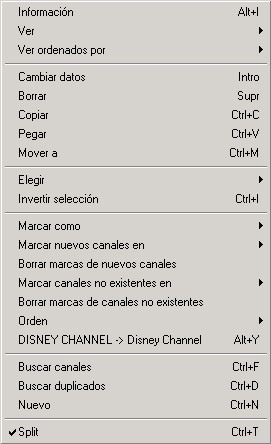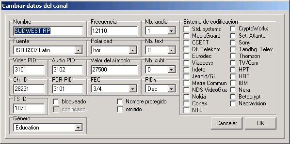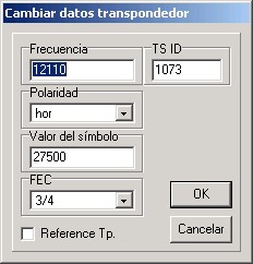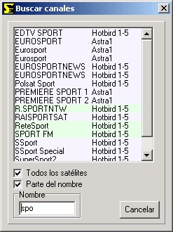 La ventana principal con la lista de satétites, Transpondedores, proveedores, favoritos, y los canales.