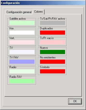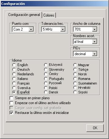 Aquí puede elegir el idioma del menú, configurar los puertos de comunicacóin, elegir si quiere ver/introducer PIDs en decimal o hexadecimal, introducer la tolerancia de frecuencia para la importación, mantener el editor siempre en pantalla o cambiar los colores en la lista de objetos.
