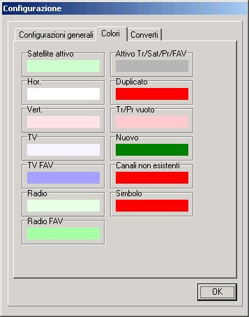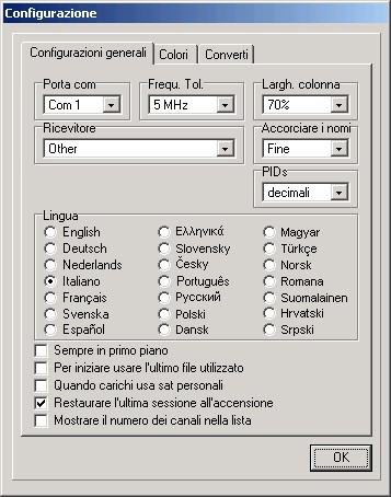 Da qui puoi scegliere il linguaggio del menu, configurare le porte di comunicazione, scegliere se preferisci vedere/inserire i PID in decimali o hexadecimali, inserire la tolleranza in frequenza per l'importazione, mantenere sempre l'editore in primo piano o cambiare i colori degli elementi della lista.