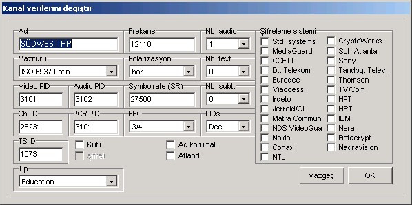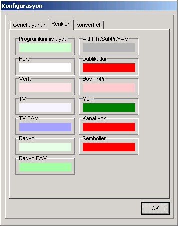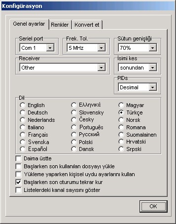 Burada menü dili, bağlantı yeri, PID'lerin ve kanal listesinin görüntüsü ayarlanır ve yabancı formatların importu için frekans toleransı verilir. Ayrıca burada SetEdit'in yazı ve ekran renklerini değiştirebilirsiniz.