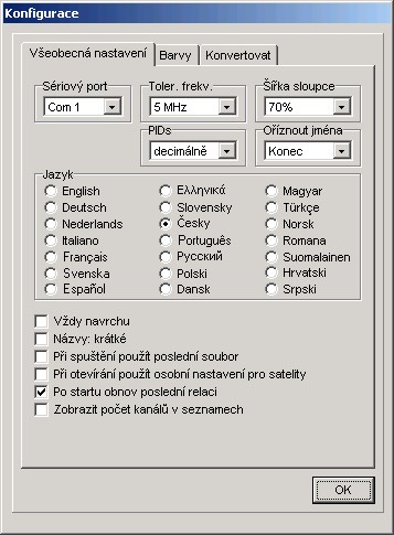 Zde mŭžete změnit jazyk menu, nakonfigurovat komunikační bránu, chcete-li vidět/zadat PIDs v desítkové či šestnáctkové soustavě, zadat frekvenci, toleranci pro import, umístit okno editoru vždy v horní části nebo změnit barvy jednotlivých položek seznamu.