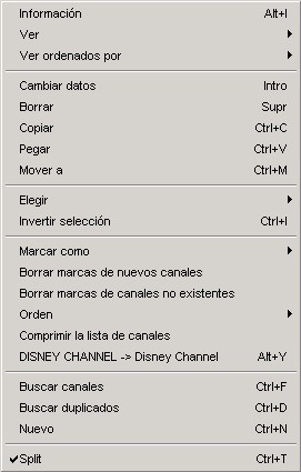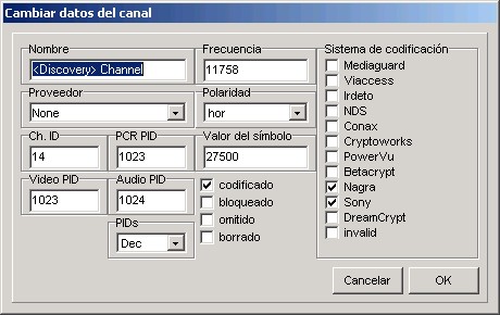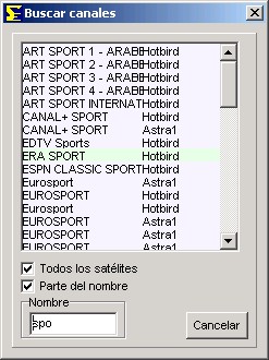 La ventana principal con la lista de satétites, Transpondedores, proveedores, favoritos, y los canales.