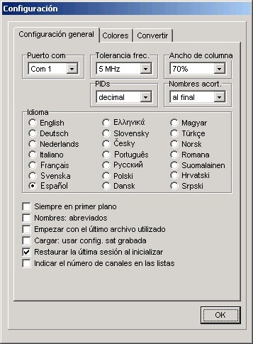 Aquí puede elegir el idioma del menú, configurar los puertos de comunicacóin, elegir si quiere ver/introducer PIDs en decimal o hexadecimal, introducer la tolerancia de frecuencia para la importación, mantener el editor siempre en pantalla o cambiar los colores en la lista de objetos.