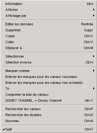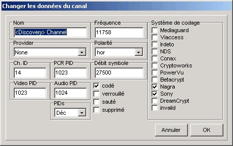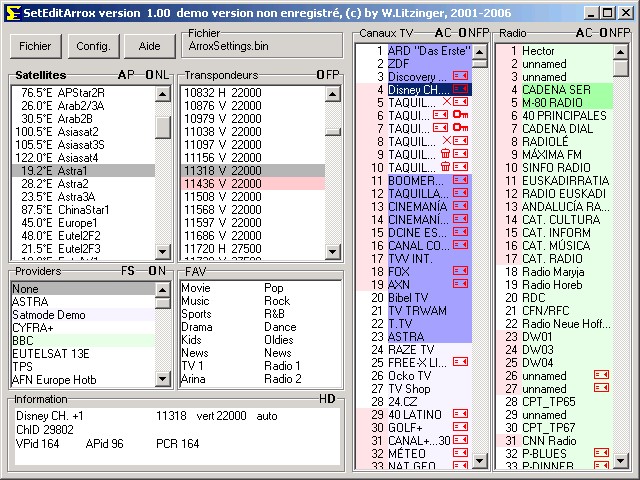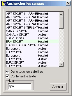 La fentre principale, vous voyez tous les satellites, transpondeurs, providers, FAV, et naturellement les canaux.
