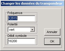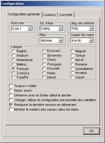 Ici vous pouvez choisir la langue du menu, choisir si vous voulez voir/entrer les PIDs en dcimal ou en hexadcimal, entrer la tolrance de la frquence pour l'import, changer les couleurs et entrer les donnes du rseau.