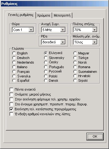Εδώ μπορείτε να επιλέξετε γλώσσα, τη μορφή των PID (δεκαδική ή δεκαεξαδική) και της λίστας καναλιών, την ανοχή συχνότητας για την εισαγωγή άλλων μορφών(formats), και να ρυθμίσετε τα ports επικοινωνίας. Εξάλλου μπορείτε να αλλάξετε τη γραφή και τα χρώματα φόντου του SetEdit.