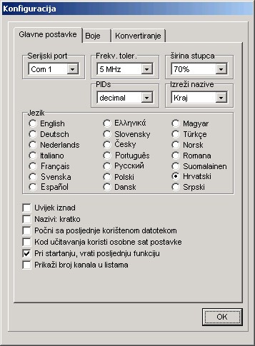 Ovdje možete izabrati izbornik za jezike, namjestiti portove za komuniciranje, izabrati ako želite vidjeti/unijeti u dekadskom ili heksadekadskom obliku, unijeti dozvoljenu frekvenciju za import, čuvati editor uvijek iznad svih ili promijeniti boje stavkama liste.