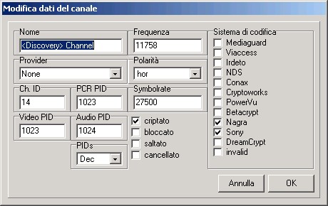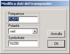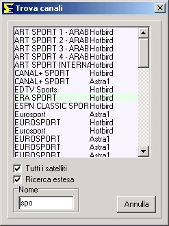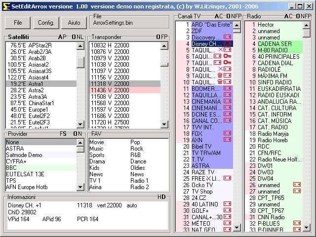 La finestra principale, vedi tutti i satellite, transponder, provider, FAV, e naturalmente i canali.