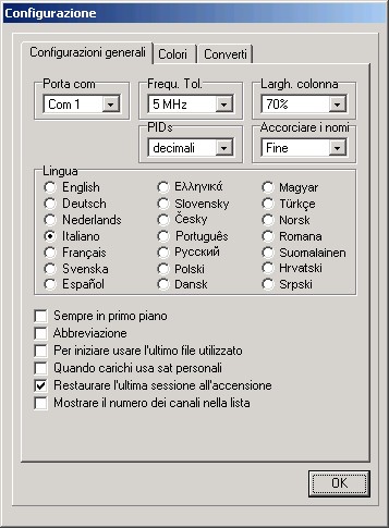 Da qui puoi scegliere il linguaggio del menu, configurare le porte di comunicazione, scegliere se preferisci vedere/inserire i PID in decimali o hexadecimali, inserire la tolleranza in frequenza per l'importazione, mantenere sempre l'editore in primo piano o cambiare i colori degli elementi della lista.