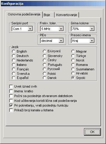 Ovde možete da izaberete jezički meni, konfigurišete portove za komunikaciju, izaberete ukoliko želite da vidite/unesete PID-ove u decimalnom ili heksadecimalnom obliku, unesete dozvoljenu frekvenciju za import, čuvate editor uvek iznad svih ili da promenite boje delovima liste.