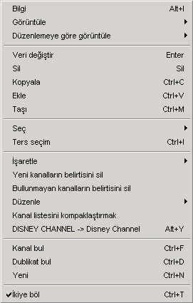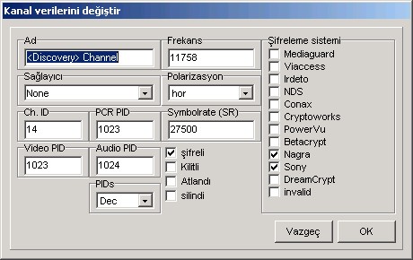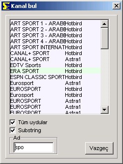 Ana pencere, burada tüm Uydular, Transponderler, Sağlayıcılar, Favoriler, görüyorsunuz ve tabiiki kanalları.