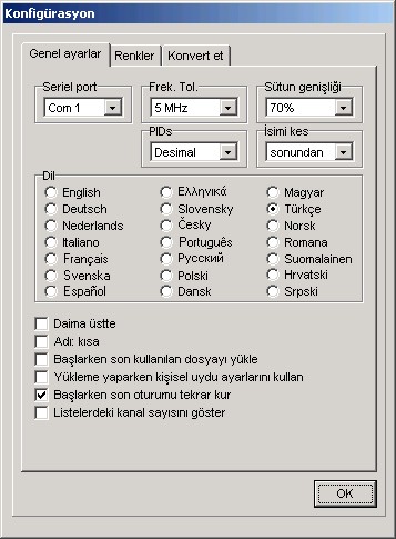 Burada menü dili, bağlantı yeri, PID'lerin ve kanal listesinin görüntüsü ayarlanır ve yabancı formatların importu için frekans toleransı verilir. Ayrıca burada SetEdit'in yazı ve ekran renklerini değiştirebilirsiniz.