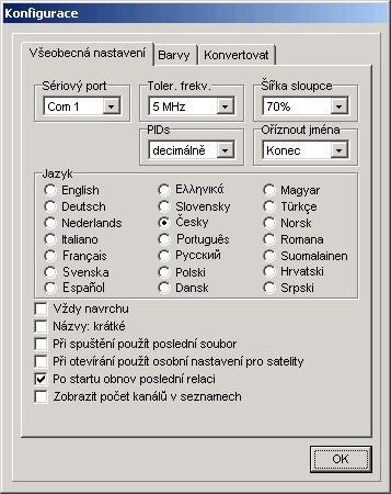 Zde mŭžete změnit jazyk menu, nakonfigurovat komunikační bránu, chcete-li vidět/zadat PIDs v desítkové či šestnáctkové soustavě, zadat frekvenci, toleranci pro import, umístit okno editoru vždy v horní části nebo změnit barvy jednotlivých položek seznamu.