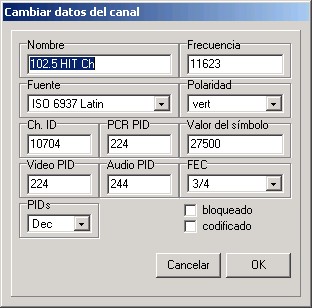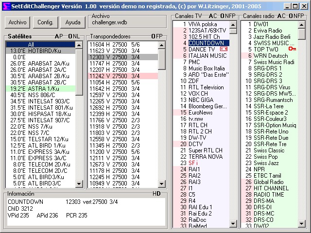 La ventana principal con la lista de satétites, Transpondedores, y los canales.