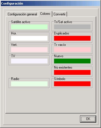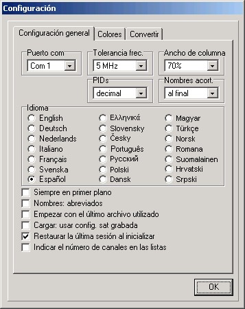 Aquí puede elegir el idioma del menú, configurar los puertos de comunicacóin, elegir si quiere ver/introducer PIDs en decimal o hexadecimal, introducer la tolerancia de frecuencia para la importación, mantener el editor siempre en pantalla o cambiar los colores en la lista de objetos.