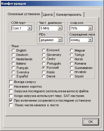 Здесь Вы можете выбрать язык меню, интерфейс, изображение PID, настройки листа каналов, задать допустимое отклонение частоты для импорта неизвестных форматов. Кроме того, вы можете здесь изменить шрифт и фон.