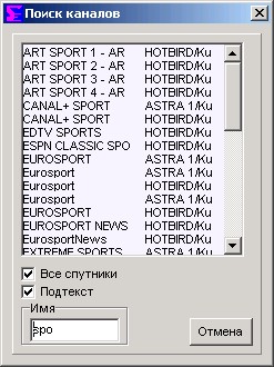Главное окно, здесь Вы видите все спутники, транспондера, и, конечно каналы