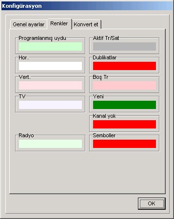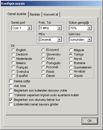 Burada menü dili, bağlantı yeri, PID'lerin ve kanal listesinin görüntüsü ayarlanır ve yabancı formatların importu için frekans toleransı verilir. Ayrıca burada SetEdit'in yazı ve ekran renklerini değiştirebilirsiniz.
