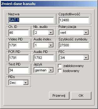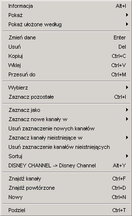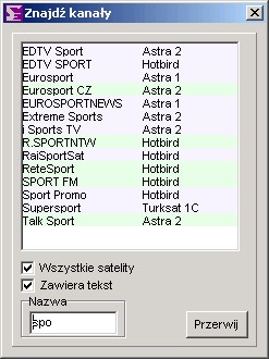 Okno główne, tutaj widzimy wszystkie satelity, transpondery, ulubione, i oczywiście kanały.