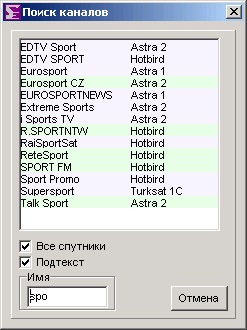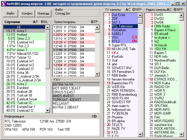 Главное окно, здесь Вы видите все спутники, транспондера, FAV, и, конечно каналы