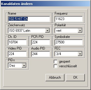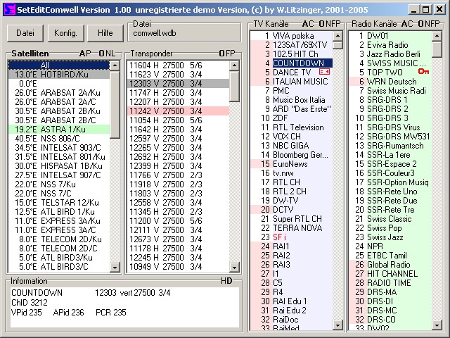 Das Hauptfenster, hier sehen Sie alle Satelliten, Transponder, und natürlich die Kanäle.