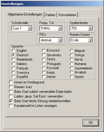 Hier werden die Menüsprache, die Schnittstelle, die Darstellung der PIDs und der Kanalliste eingestellt und eine Frequenztoleranz für den Import von Fremdformaten eingegeben. Außerdem können Sie hier die Schrift- und Hintergrundfarben von SetEdit verändern.
