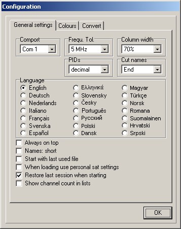 Here you can choose the menu language, configure the communication ports, choose if you like to see/enter PIDs in decimal or hexadecimal, enter the frequency tolerance for the import, keep the editor always on top or change the colors of the list items.